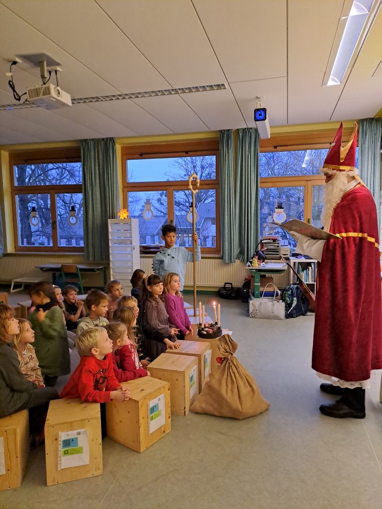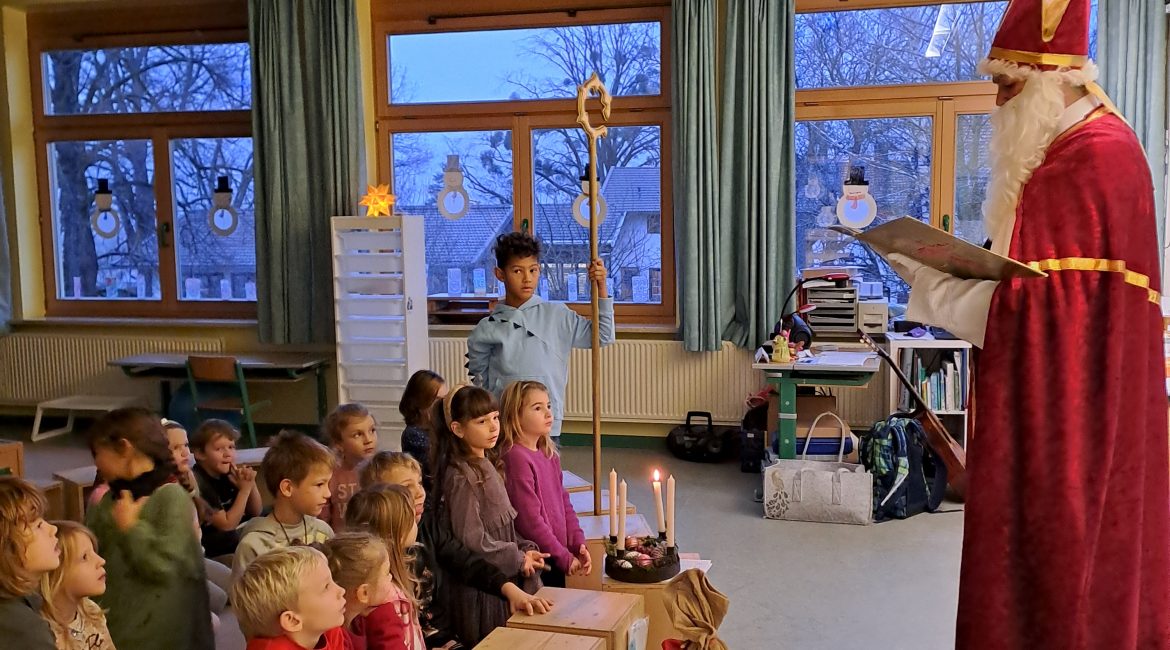 Traditionell besuchte uns auch in diesem Jahr am 6. Januar der Nikolaus. Für jede Klasse nahm er sich Zeit, lobte die Kinder für Ihr Verhalten und Arbeiten in der Schule und verteilte kleine Geschenke. Natürlich hatten die Schülerinnen und Schüler auch eine Überraschung für den Nikolaus vorbereitet und so bedankten sich die Kinder für sein Kommen mit Liedern und Gedichten. Vielen Dank an den Nikolaus und an unseren Elternbeirat.