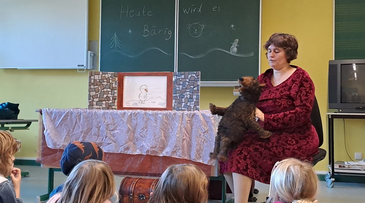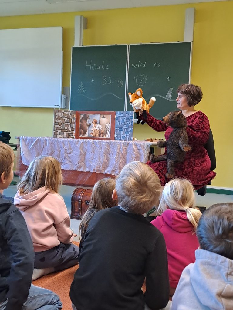 Seit mehreren Jahren besucht uns Gertis Märchenkiste vor den Weihnachtsferien und entführt uns in die Welt der Märchen und Geschichten. Mit der Unterstützung von Handpuppen und toll gestalteten Bildern nahm Gerti unsere Schülerinnen und Schülern dieses Mal mit in tief verschneite Welten, in denen Tiere und Menschen zusammenrücken, gemeinsam Zeit verbringen und Freunde werden. Alle waren sich einig, es war einfach „bärig“.