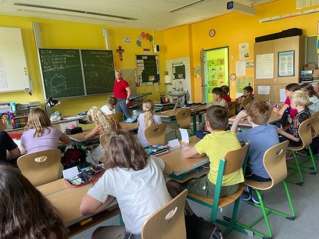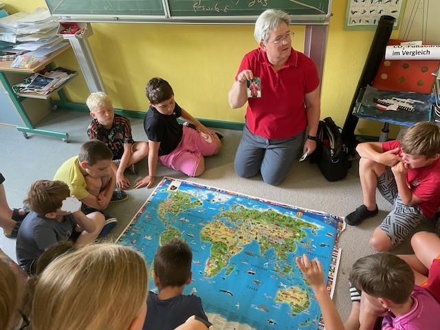 Zunächst wurde besprochen welche Faktoren für den menschengemachten Klimawandel verantwortlich sind. Dabei wurde an Vorwissen angeknüpft, viele Fachbegriffe erklärt und eingeordnet. Im Anschluss lernten die Schülerinnen und Schüler an einer Weltkarte unterschiedliche Kinder aus verschiedenen Regionen kennen und besprachen, wie das veränderte Klima deren Lebenssituationen negativ verändert. Dass einige dadurch sogar zur Flucht gezwungen werden, erkannten die Grundschüler.