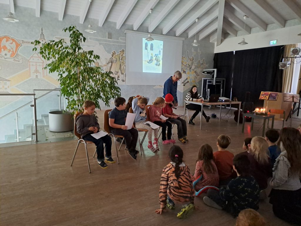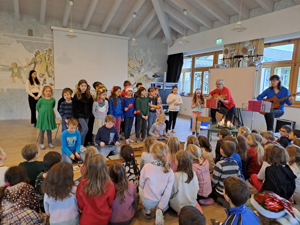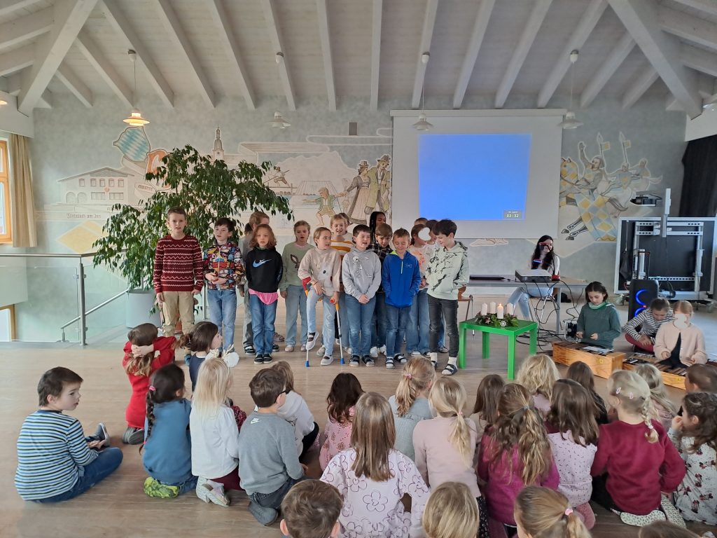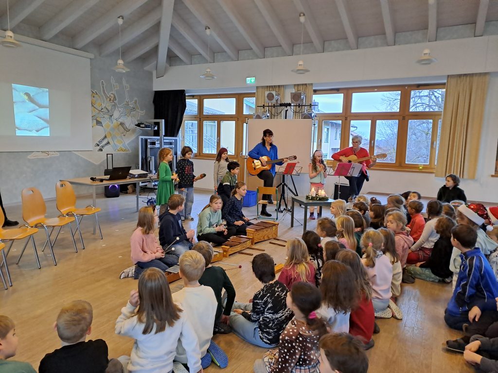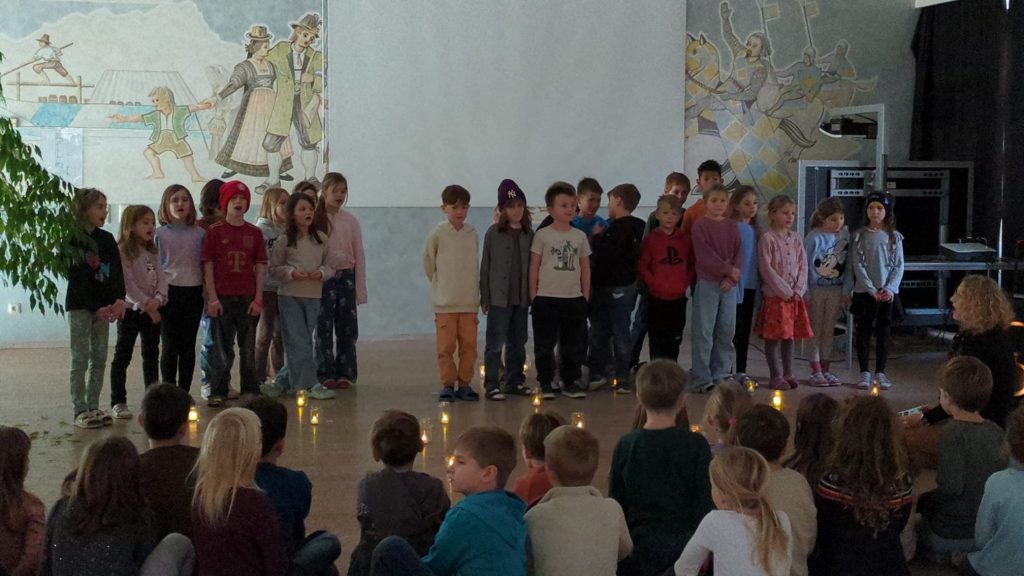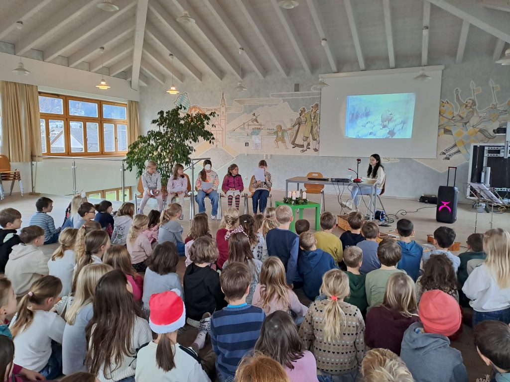 Im Anschluss daran wird das Buch „Die vier Lichter des Hirten Simons“ gelesen, das uns auf schöne und nachdenkliche Weise durch die Adventszeit begleitet. Den Auftakt am ersten Advent gestalteten die Kinder der 4. Klasse gemeinsam mit zwei mutigen Kindern aus der Klasse 1a. Sie lasen uns den ersten Teil der Geschichte vor und stimmten uns wunderbar auf die kommende Zeit ein. Danach präsentierte uns die 4a das Lied „Leise rieselt der Schnee“ mit Flöten- und Orffmusik, in der Hoffnung, dass der Schnee den Weg zu uns ins Tal findet.