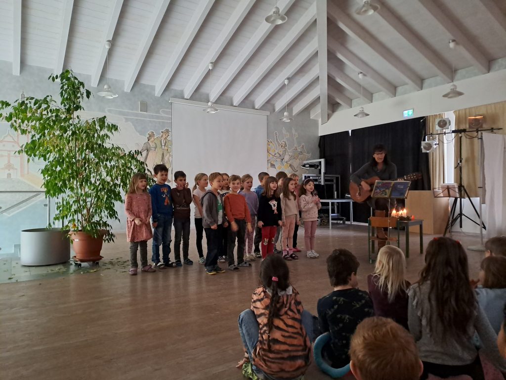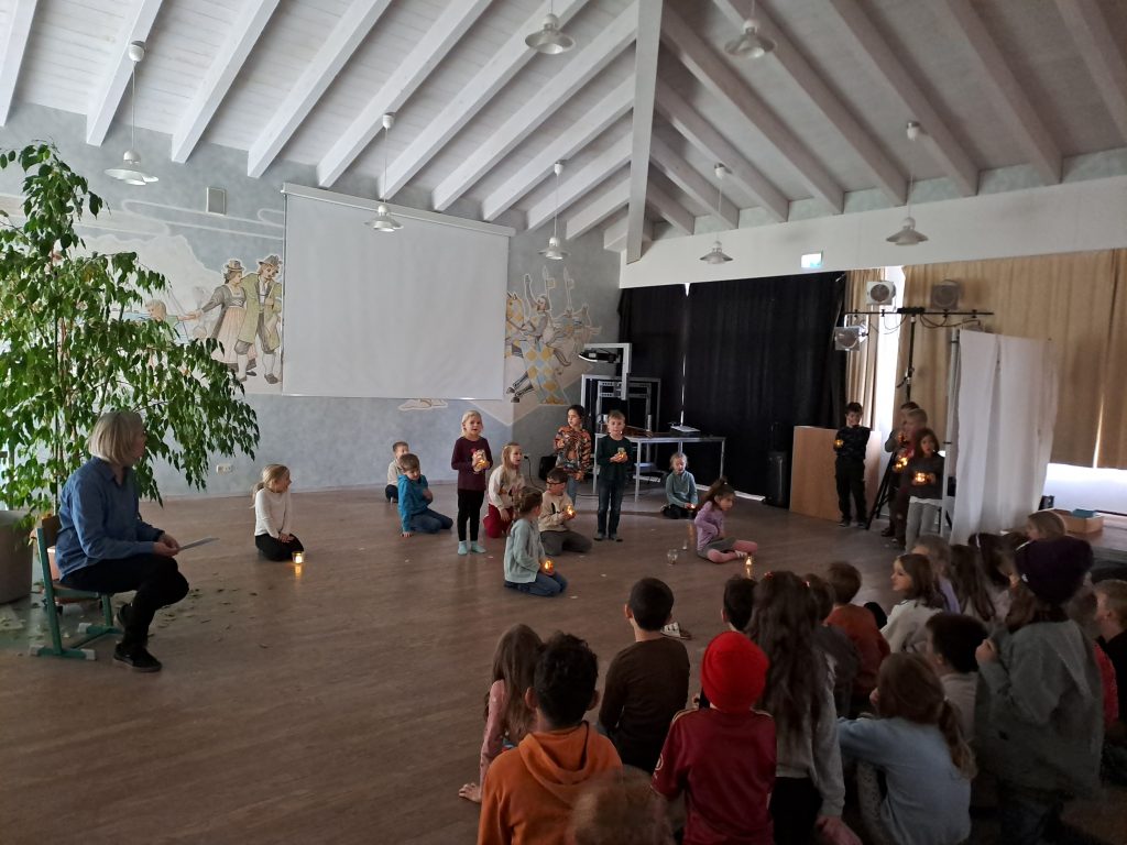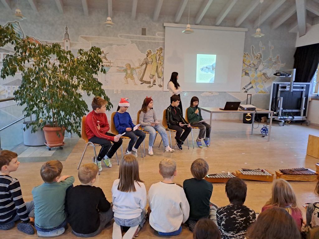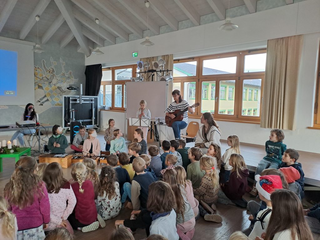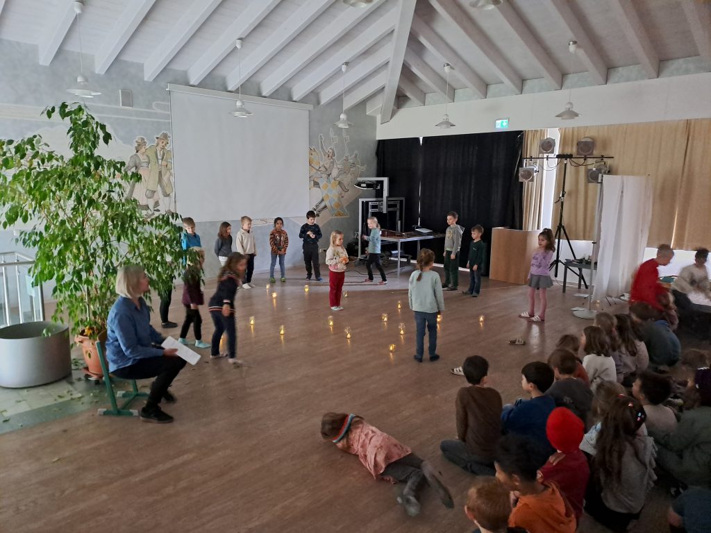 Im Anschluss daran wird das Buch „Die vier Lichter des Hirten Simons“ gelesen, das uns auf schöne und nachdenkliche Weise durch die Adventszeit begleitet. Den Auftakt am ersten Advent gestalteten die Kinder der 4. Klasse gemeinsam mit zwei mutigen Kindern aus der Klasse 1a. Sie lasen uns den ersten Teil der Geschichte vor und stimmten uns wunderbar auf die kommende Zeit ein. Danach präsentierte uns die 4a das Lied „Leise rieselt der Schnee“ mit Flöten- und Orffmusik, in der Hoffnung, dass der Schnee den Weg zu uns ins Tal findet.